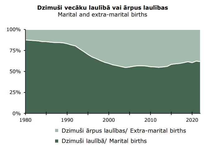 100% grēdotā laukumu diagrammā attēlots Latvijā dzimušo bērnu sadalījums: dzimuši laulībā vai ārpus laulības. Avots: Centrālā statistikas pārvalde