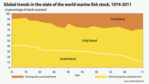 100% grēdotā laukumu diagrammā attēloti jūras zivju resursi pasaulē pēc stāvokļa: pārzvejots (pārsniegta bioloģiski drošā robeža), normāla nozveja, nepietiekams nozvejas apjoms. Avots: Pārtikas un lauksaimniecības organizācija (Food and Agriculture Organisation)