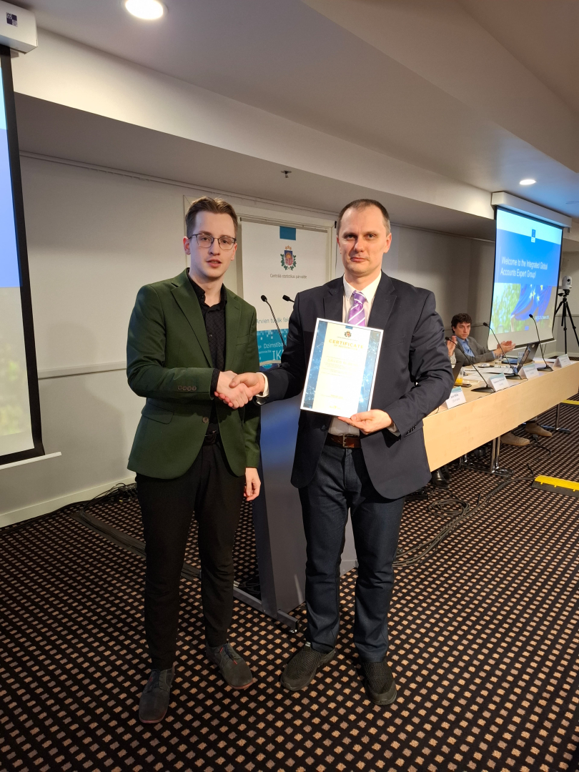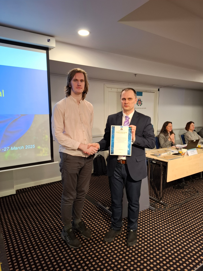 Juris Nitišs, CSP makroekonomiskās statistikas departamenta eksperts, pasniedz Centrālās statistikas pārvaldes priekšnieka apliecinājumu Dāvidam Rubenam