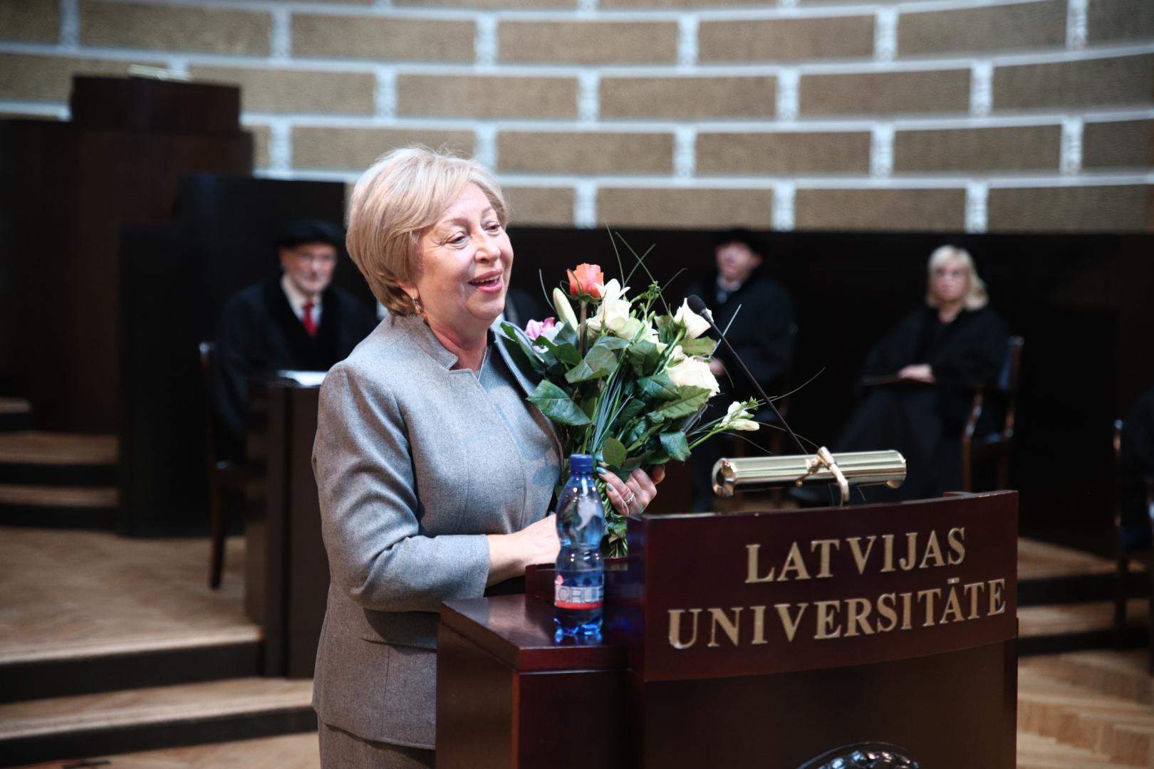 Par lielo ieguldījumu Latvijas Universitātes studiju kvalitātes nodrošināšanā un pētniecības attīstībā LU 101. gadadienai veltītajā svinīgajā Senāta sēdē par LU Goda biedru ievēlēja Centrālās statistikas pārvaldes priekšnieci Aiju Žīguri.