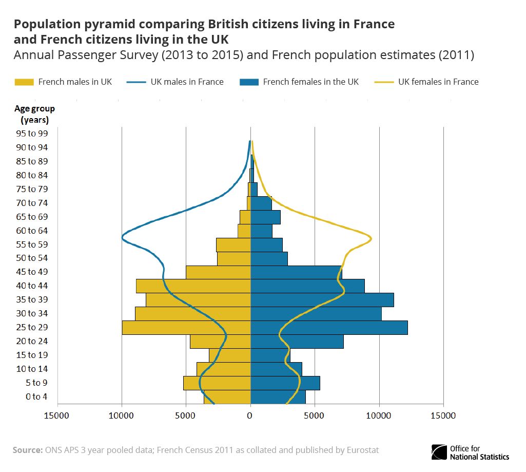 Iedzīvotāju piramīda salīdzina dzimuma un vecuma struktūru Francijas valsts piederīgajiem, kas dzīvo Lielbritānijā (joslas) un Lielbritānijas pilsoņiem, kas dzīvo Francijā (līnija) . Avots: Lielbritānijas valsts statistikas birojs