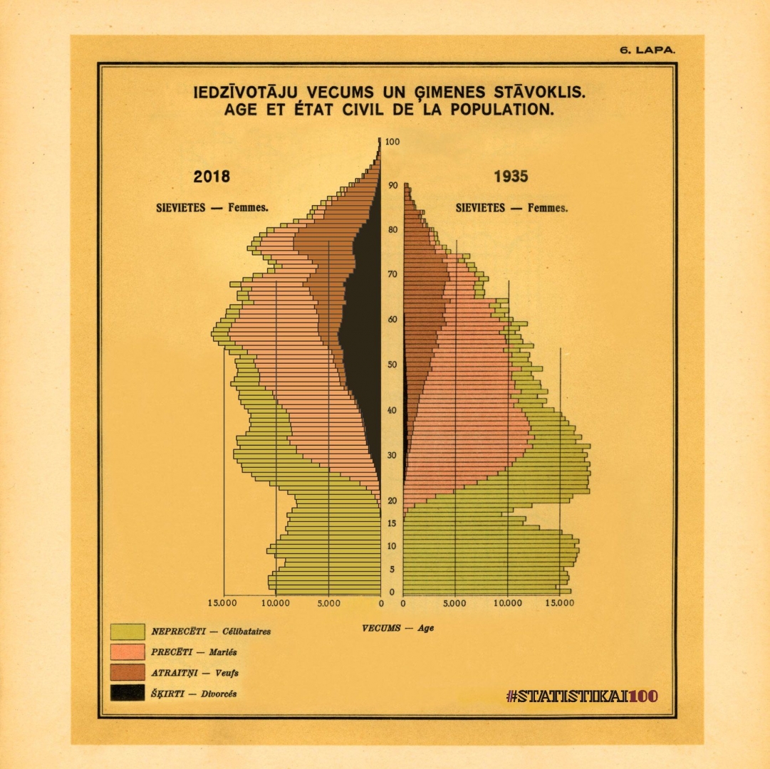 Par godu Latvijas simtgadei Centrālā statistikas pārvalde izvēlējās papildināt 1938. gadā izdotajā “Latvijas statistikas atlasā” publicēto iedzīvotāju piramīdu, salīdzinot katru dzimumu 1935. gadā un 2018. gadā. Šajā iedzīvotāju piramīdā ir salīdzinātas sievietes pēc vecuma un ģimenes stāvokļa 2018. gadā un 1935. gadā. Avots: Centrālā statistikas pārvalde