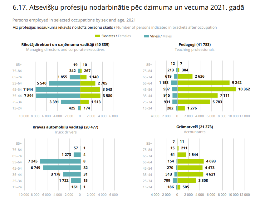 Četras iedzīvotāju piramīdas attēlo atsevišķās profesijās nodarbināto iedzīvotāju dzimuma un vecuma struktūru. Horizontālās ass solis visās diagrammās ir vienāds, lai salīdzinājums būtu korekts. Avots: Centrālā statistikas pārvalde