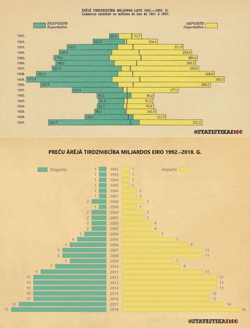 Par godu Latvijas simtgadei Centrālā statistikas pārvalde atdarinājusi 1938. gadā izdotajā “Latvijas statistikas atlasā” publicēto “iedzīvotāju piramīdu”, kurā attēlota ārējā tirdzniecība (eksports un imports) no 1921. līdz 1937. gadam. 1938. gadā publicētajai diagrammai pievienota līdzīga “iedzīvotāju piramīda” par eksporta un importa apjomiem kopš neatkarības atgūšanas – no 1992. gada līdz 2018. gadam. Avots: Centrālā statistikas pārvalde