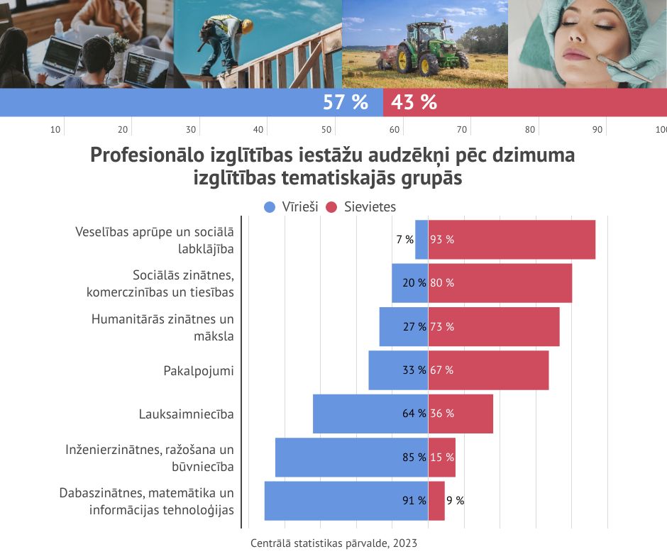 Profesionālo izglītības iestāžu audzēkņi pēc dzimuma izglītības tematiskajās grupās. Avots: Centrālā statistikas pārvalde