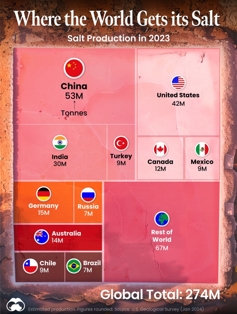 Koka kartes diagrammā attēlota atbilde uz jautājumu “Kur pasaule iegūst sāli?” jeb sāls ražošana sadalījumā pa valstīm 2023. gadā. Lielākās sāls ražotājvalstis ir Ķīna, ASV un Indija. Avots: Visual Capitalist