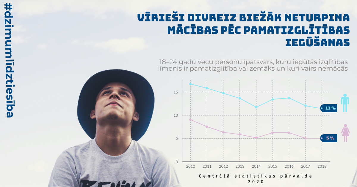 Divas līnijas parāda atšķirību starp dzimumiem – vīrieši divreiz biežāk nekā sievietes neturpina mācības pēc pamatizglītības iegūšanas un šī atšķirība nemainās laikā. Aktuālie dati (pēdējais pieejamais gads) ir izcelti, norādot vērtību. Avots: Centrālā statistikas pārvalde.