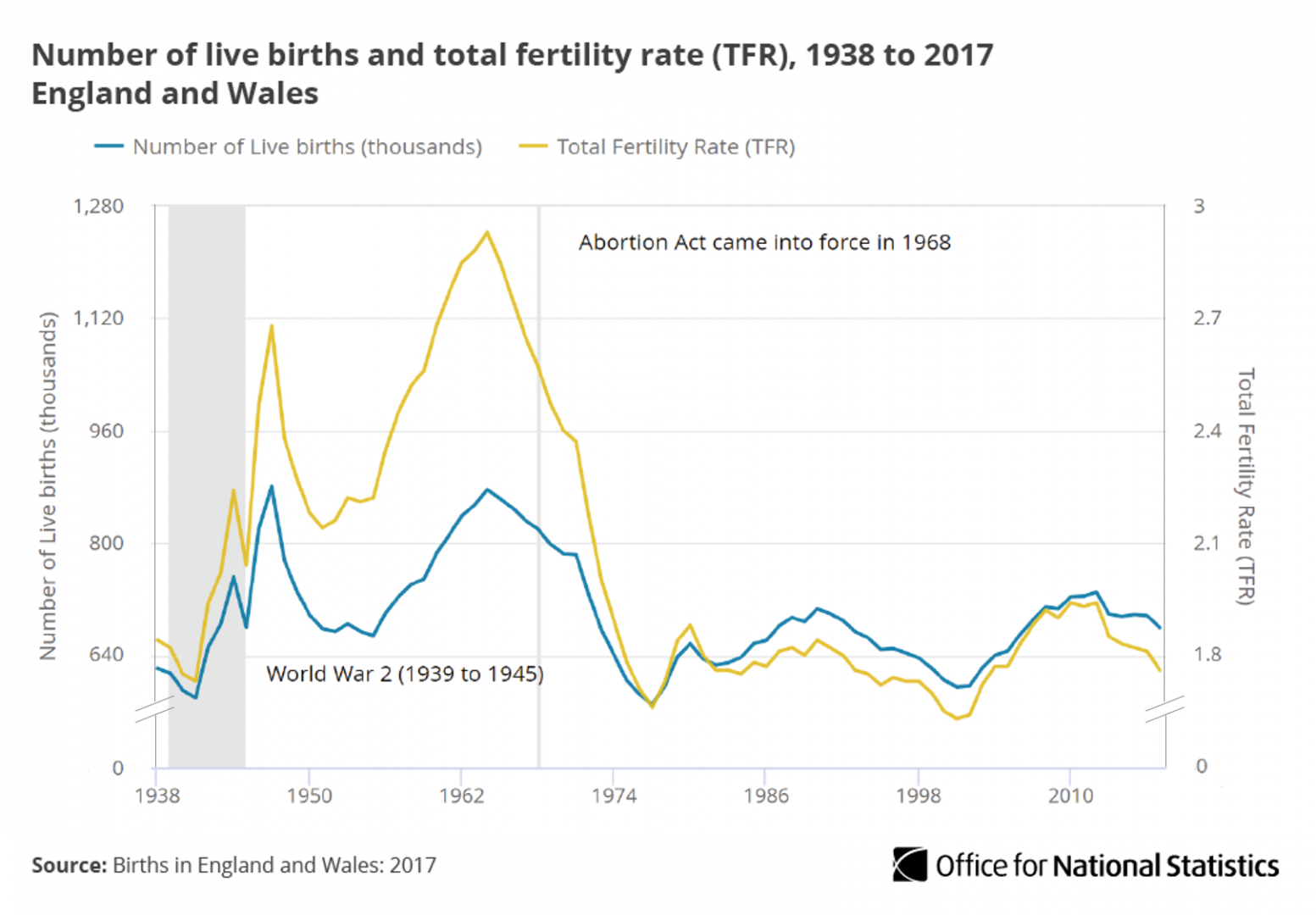 Viena līnija attēlo dzimušo skaitu (tūkstošos) un otra līnija attēlo summāro dzimstības koeficientu. Katrai līknei ir sava vertikālā ass. Abas vertikālās asis nesākas no nulles (ir attēlots pārtraukums). Ar pelēku vertikālu joslu fonā iezīmēts Otrais pasaules karš, kas izskaidro mazo dzimušo skaitu un zemo summāro dzimstības koeficientu šajos gados. Diagrammā norādīts gads, kad Anglijā stājies spēkā Abortu likums. Avots: Lielbritānijas valsts statistikas birojs
