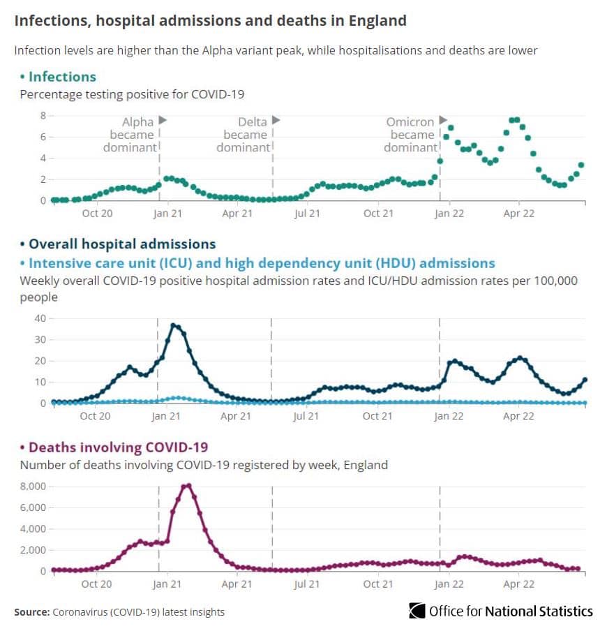 Diagrammu trio attēlo Covid-19 situāciju raksturojošus rādītājus: pozitīvo testu īpatsvaru, hospitalizēto skaitu uz 100 000 iedzīvotāju un ar Covid-19 saistīto mirušo skaitu. Šajās diagrammās ar pelēku tekstu un vertikālām līnijām iezīmēta dažādu Covid-19 vīrusa paveidu dominance. Avots: Lielbritānijas valsts statistikas birojs