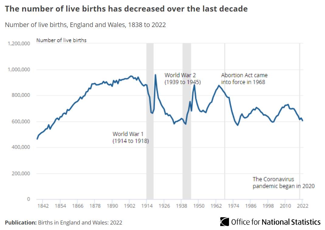 Līnija attēlo dzimušo skaita izmaiņas ilgā laika periodā – kopš 1842. gada. Līnijas īpašos pīķus un kritumus palīdz saprast paskaidrojošas piezīmes. Avots: Lielbritānijas valsts statistikas birojs