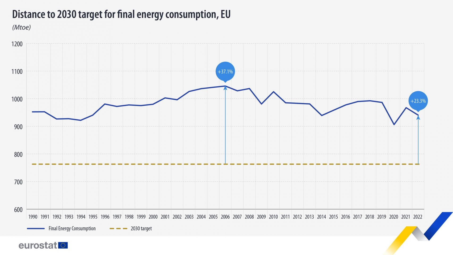 Līnija attēlo energoresursu patēriņa izmaiņas un progresu attiecībā uz mērķa sasniegšanu. Mērķis diagrammā iezīmēts ar raustītu līniju. 2006. un 2022. gadam iezīmēts, cik tālu reālais patēriņš ir no sasniedzamā mērķa. Avots: Eurostat