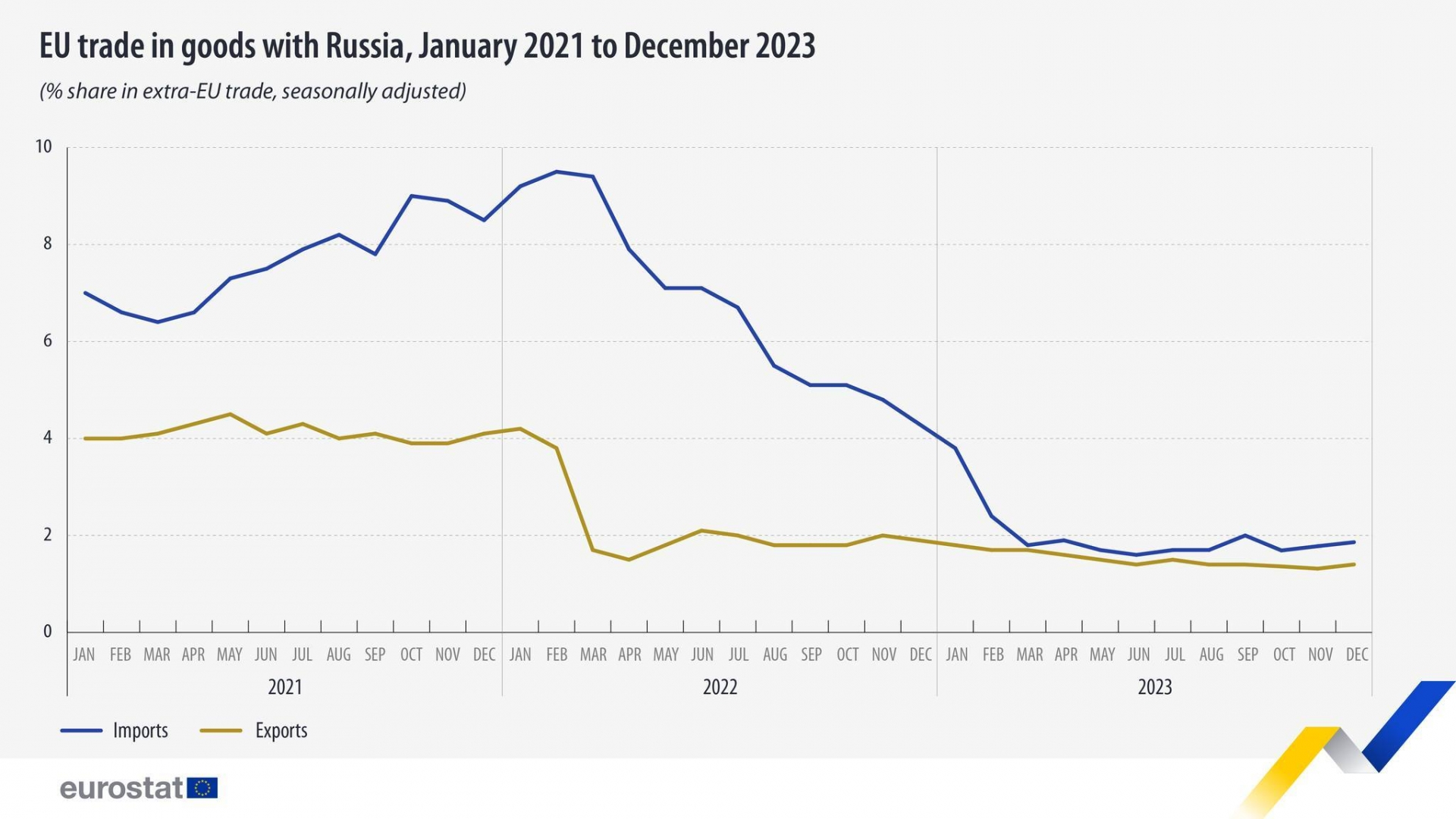 Divas līnijas parāda, ka 2023. gadā imports no Krievijas uz ES valstīm ir samazinājies, bet eksports ir samazinājies, Krievijai uzsākot karadarbību Ukrainā, un kopš tā laika nav būtiski mainījies. Avots: Eurostat