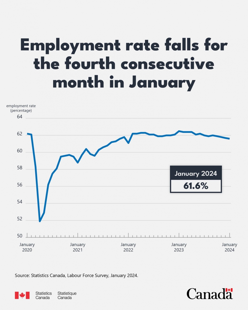 Līnija attēlo nodarbinātības līmeņa izmaiņas laikā Kanādā. Uz horizontālās ass attēloti mēneši, bet ar tekstu atzīmēts tikai katra gada janvāris, lai diagrammas dizains nebūtu pārblīvēts. Pēdējie pieejamie dati ir īpaši izcelti. Vertikālā ass nesākas ar nulli, lai izmaiņas varētu redzēt izteiksmīgāk. Tā kā vislielākais kritums ir bijis 2020. gadā, pēdējā gada izmaiņas precīzi nolasīt ir grūti, tāpēc šī informācija ietverta nosaukumā: “Janvārī nodarbinātības līmenis ir samazinājies ceturto mēnesi pēc kārtas”. Avots: Kanādas statistika