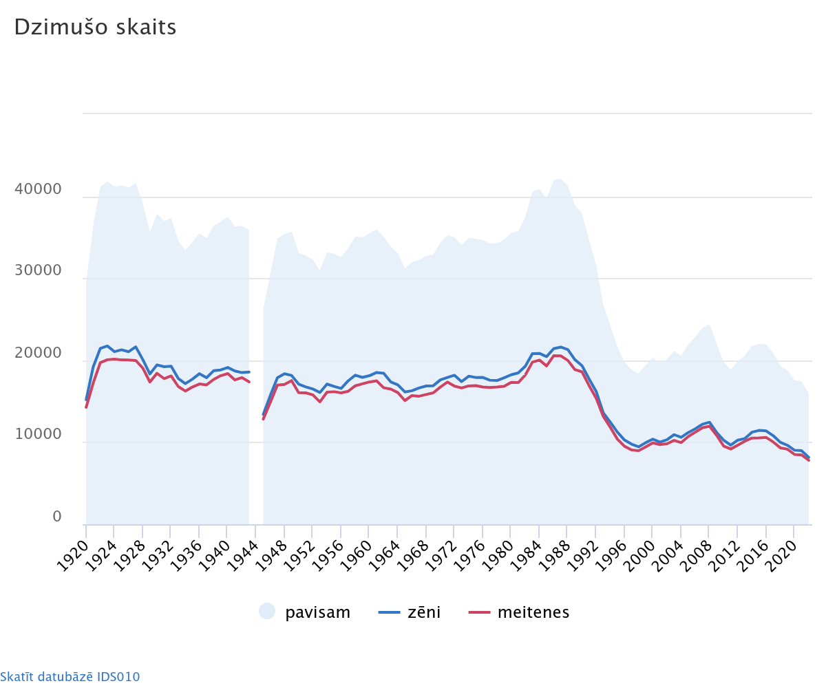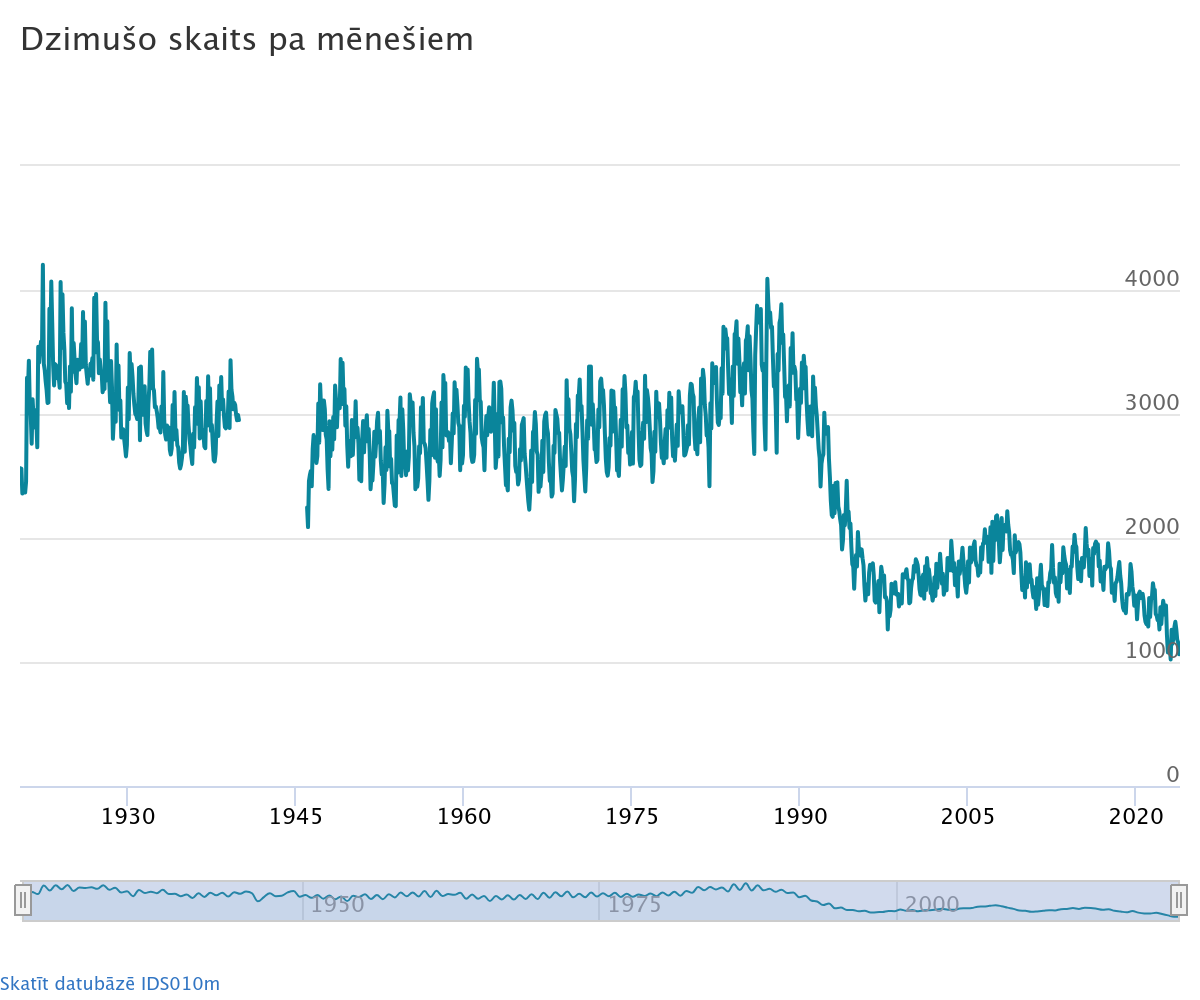 Līnija attēlo dzimušo skaitu pa mēnešiem kopš 2020. gada. Datos ir pārrāvums Otrā pasaules kara gados, kas redzams kā pārtraukums līknē. Mēneša datos var labi pamanīt, ka agrāk bija izteiktākas sezonālas svārstības. Pēdējos gados gan dzimušo skaits, gan svārstību diapazons ir samazinājies. Šis ir interaktīvs grafiks, kurā attēlojamo laika periodu var pabīdīt vai sašaurināt. Avots: Centrālā statistikas pārvalde