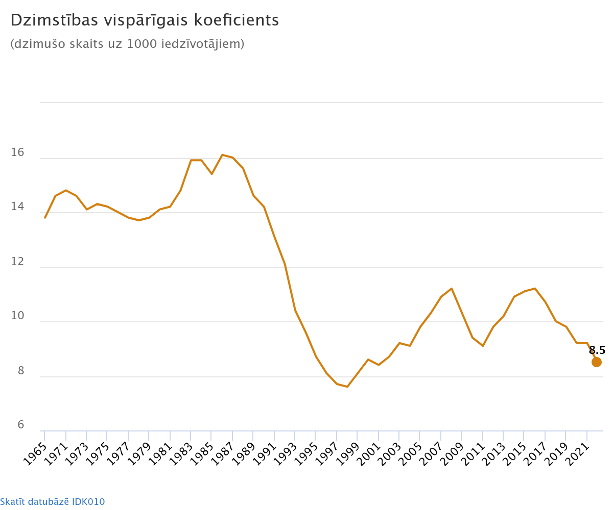 Viena līnija parāda dzimstības vispārīgā koeficienta izmaiņas Latvijā laika gaitā. Vertikālā ass nesākas no nulles, jo galvenais diagrammas vēstījums ir atspoguļot kritumu, salīdzinot ar pagājušā gadsimta 60.–80. gadiem. Avots: Centrālā statistikas pārvalde