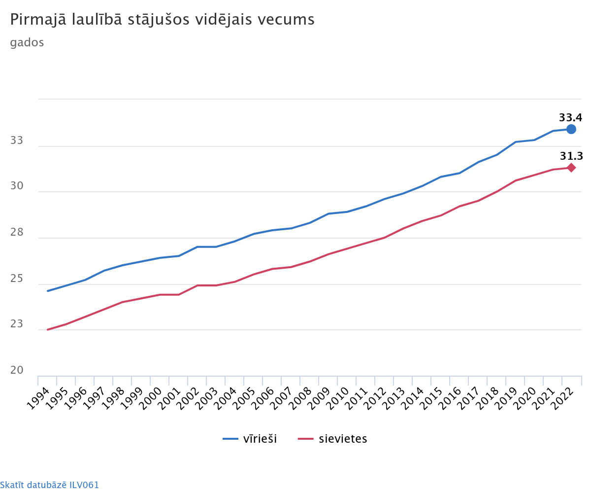 Divas līnijas parāda, kā pieaudzis pirmajā laulībā stājušos iedzīvotāju vecums Latvijā. Vertikālā ass nesākas no nulles, bet tas netraucē uztvert tendenci un izmaiņas. Avots: Centrālā statistikas pārvalde