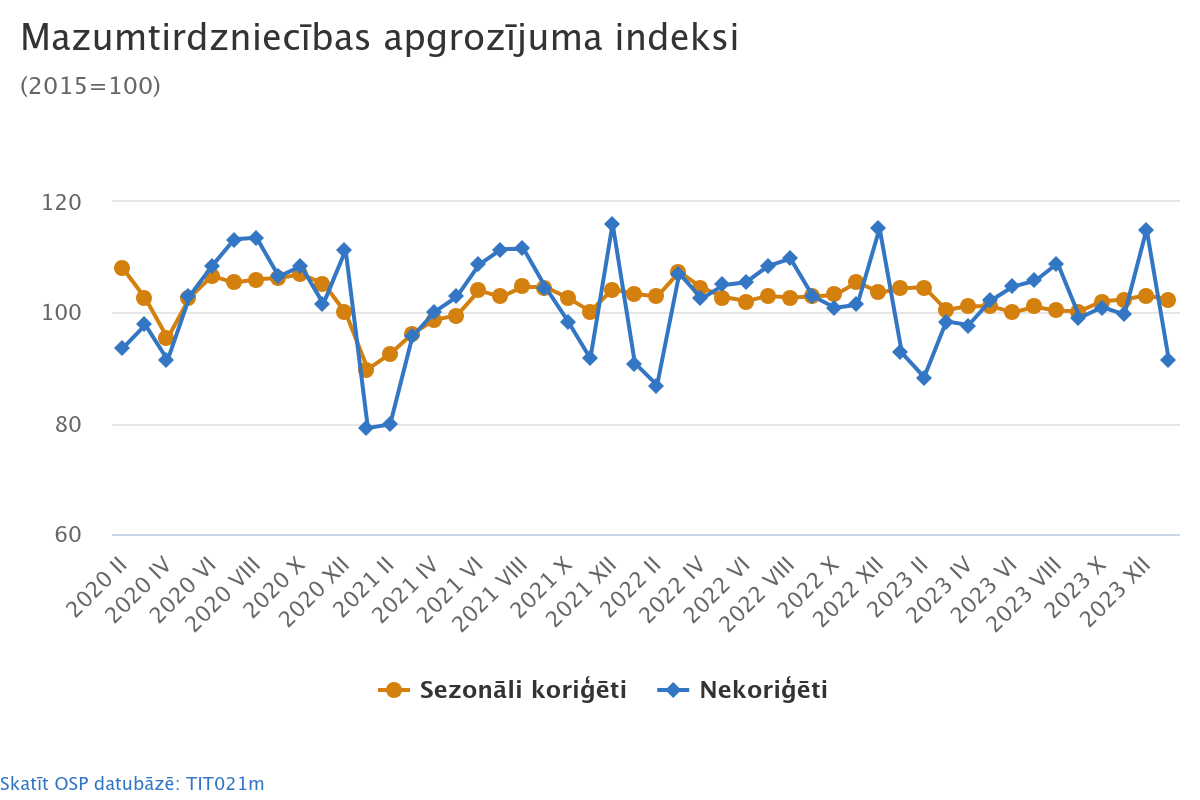 Divas līnijas attēlo, kā atšķiras un kā mainās sezonāli koriģēts un nekoriģēts mazumtirdzniecības apgrozījuma indekss. Avots: Centrālā statistikas pārvalde