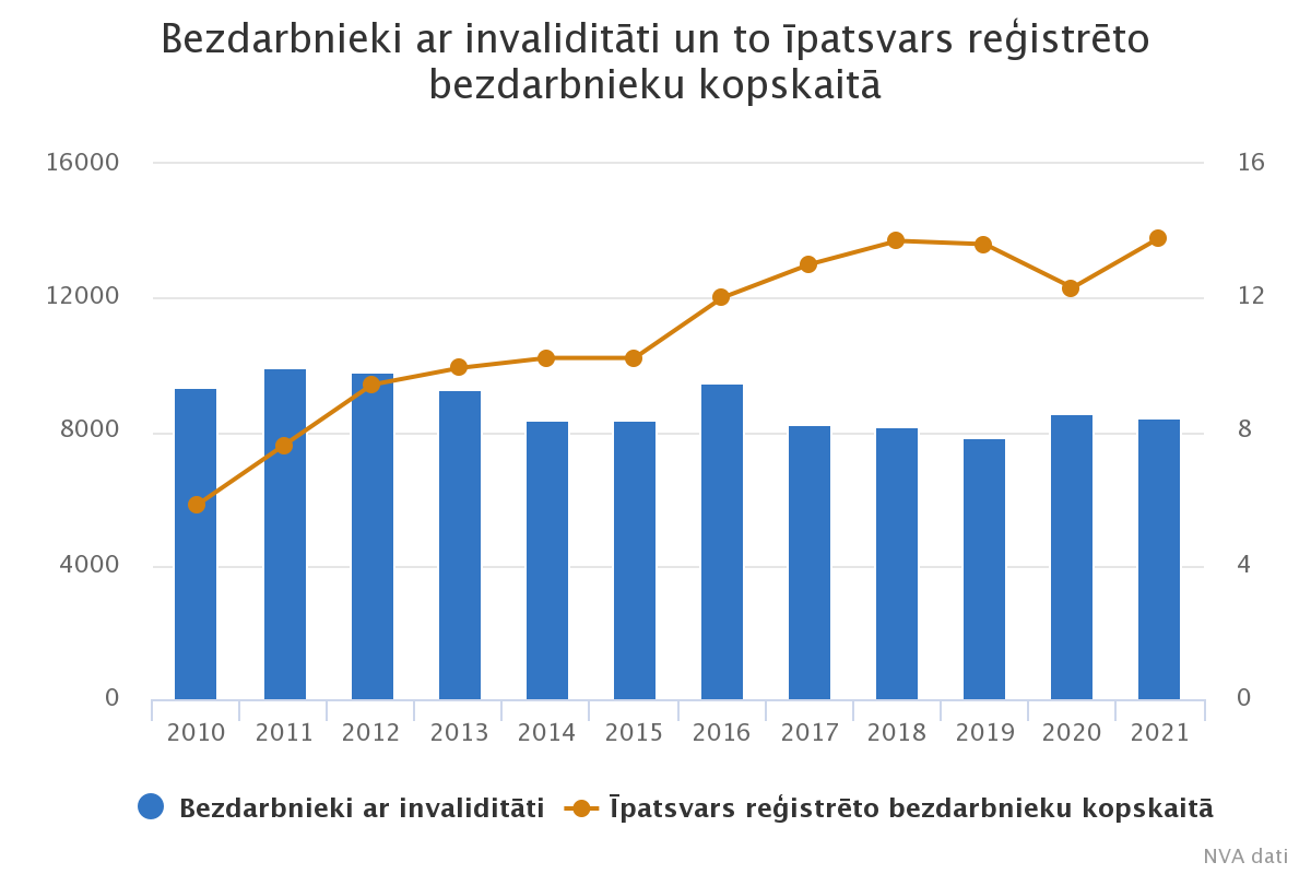 Līniju diagramma kombinēta ar stabiņu diagrammu. Stabiņi attēlo bezdarbnieku ar invaliditāti kopskaita izmaiņas laikā, kas šajā laika periodā svārstās no aptuveni astoņiem līdz desmit tūkstošiem (kreisā ass), pēdējos gados stabili ap astoņiem tūkstošiem, bet līnija attēlo bezdarbnieku īpatsvaru reģistrēto bezdarbnieku kopskaitā un tai ir augšupejoša tendence no 6 % līdz 14 % (labā ass). Diagrammai ir divas asis, jo katram rādītājam ir sava mērvienība, bet, lai būtu vieglāk uztvert, tās ir nolīdzinātas – vienā pusē ir 4 tūkstoši, otrā – 4 % utt. Avots: Centrālā statistikas pārvalde
