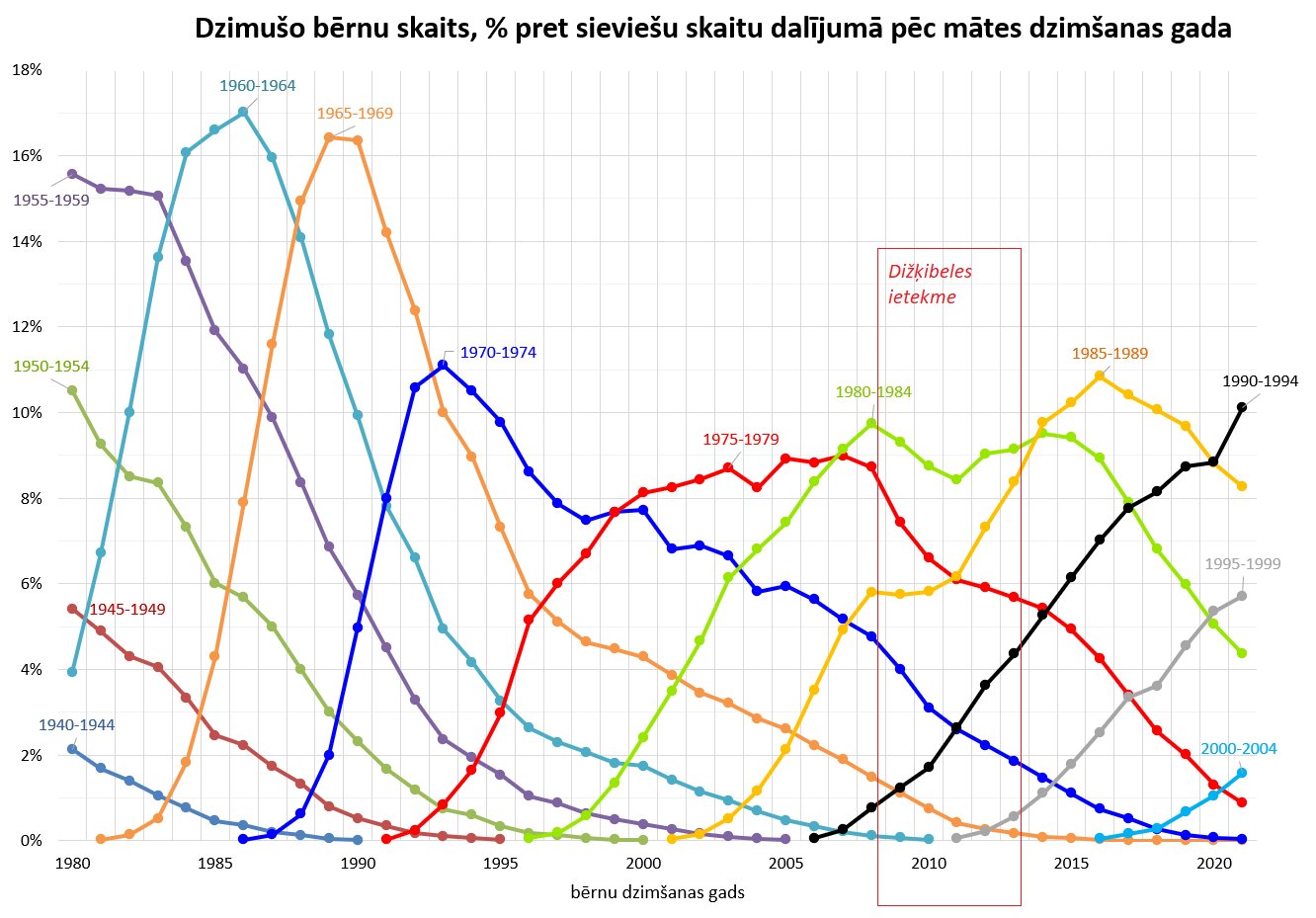 Līnijas attēlo dzimušo bērnu skaitu pa gadiem pēc mātes dzimšanas gada. Katra līnija apzīmē vienu sieviešu paaudzi (5 gadu vecuma grupu). Diagrammā ir daudz līkņu un daudz krāsu, tā prasa iedziļināšanos un laiku, lai izpētītu kopsakarības. Avots: Jānis Hermanis, publicēts Twitter kontā j_hermanis