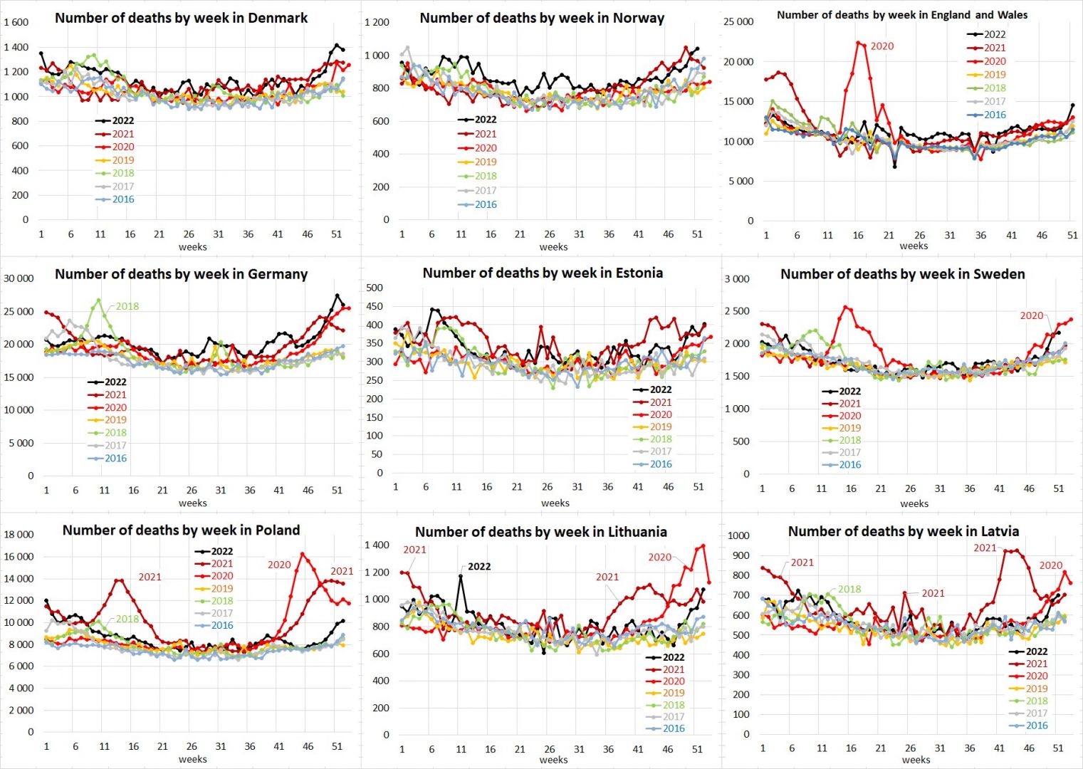 Diagrammu komplekts attēlo mirušo skaitu pa nedēļām vairākos gados un daudzās valstīs. Ar melnu un treknāku līniju attēlots tobrīd aktuālais – 2022. gads. Ja kādā valstī citos gados ir bijuši īpaši mirstības pīķi, tie atzīmēti ar piezīmi, tādējādi atvieglojot informācijas uztveri. Avots: Jānis Hermanis, publicēts Twitter kontā j_hermanis