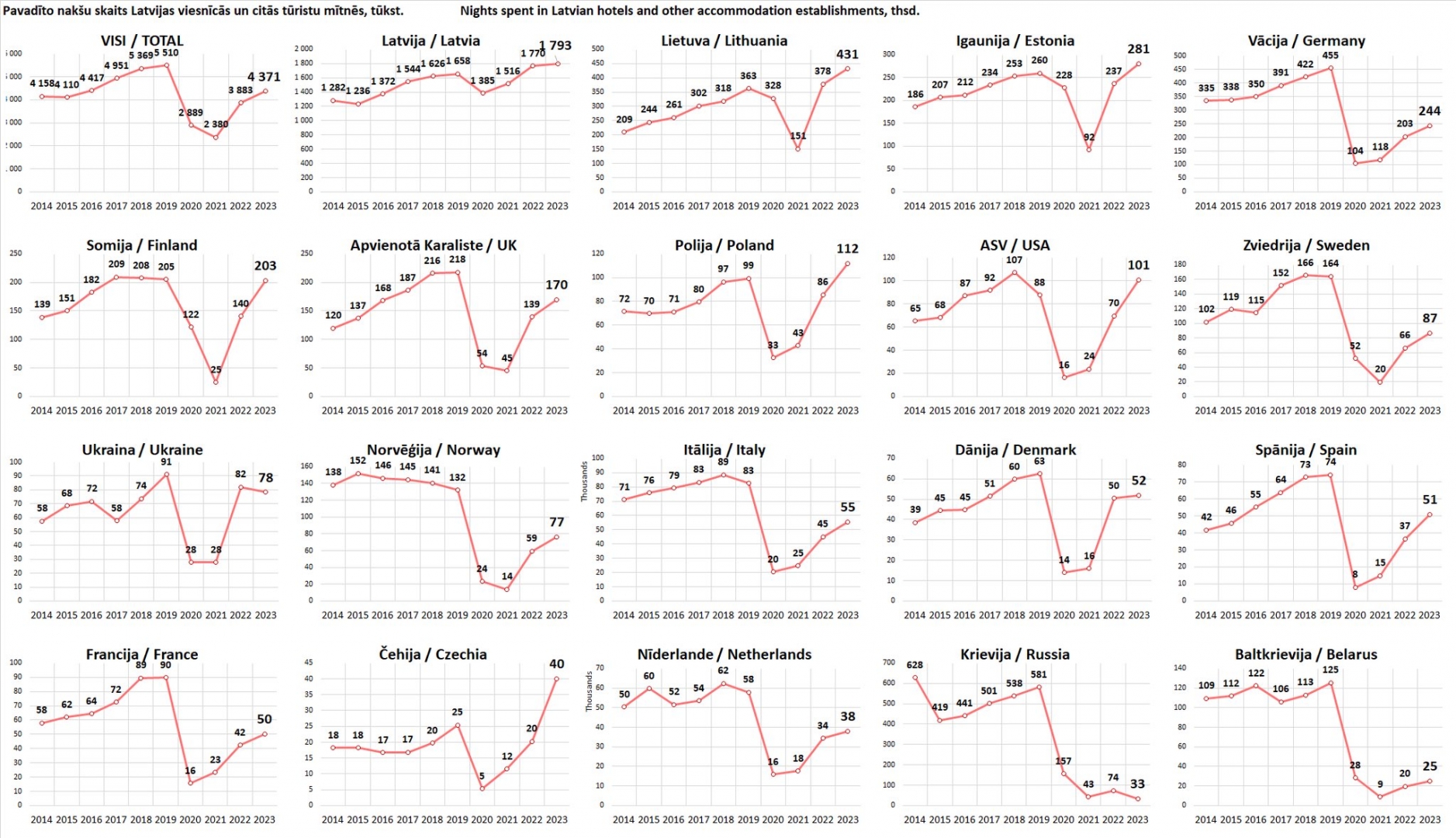 Diagrammu ansamblis attēlo Covid-19 ietekmi uz tūrismu (pavadīto nakšu skaitu) dažādās valstīs. Avots: Jānis Hermanis, publicēts Twitter kontā j_hermanis