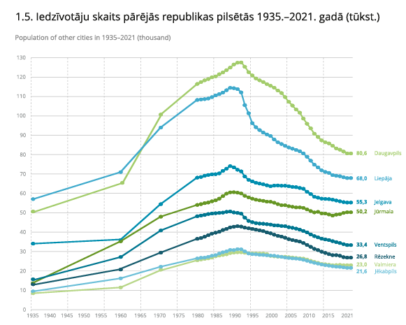 Līnijas attēlo iedzīvotāju skaita izmaiņas republikas pilsētās, izņemot Rīgu, jo Rīgas līnija ar lielo iedzīvotāju skaitu traucētu uztvert pārējo pilsētu līnijas. Aplīši uz līknēm attēlo datu punktus. Redzams, ka senākos gados dati pieejami retāk, tāpēc līnijas trajektorija var nebūt precīza. Pēdējā gada vērtība sniegta diagrammā. Leģendas vietā izmantota iespēja līnijas nosaukumu pierakstīt pie līnijas. Avots: Centrālā statistikas pārvalde