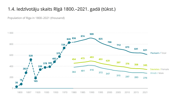 Iedzīvotāju skaita izmaiņas Rīgā attēlo augšējā līnija. Laika periodā, par kuru dati nav pieejami, katru gadu līnija ir raustīta un ar aplīšiem attēloti datu punkti, lai tam pievērstu uzmanību. Divas papildu līnijas parāda sieviešu un vīriešu skaitu. Avots: Centrālā statistikas pārvalde