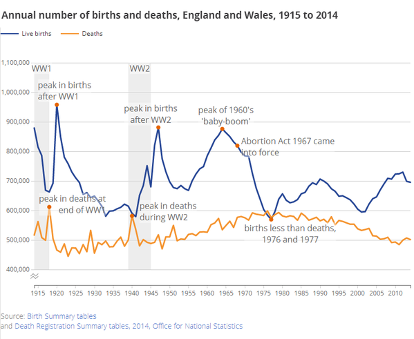 Līnijas attēlo dzimušo un mirušo skaita izmaiņas ilgā laika periodā – kopš 1915. gada. Līnijas īpašos pīķus un kritumus palīdz saprast paskaidrojošas piezīmes. Avots: Lielbritānijas valsts statistikas birojs