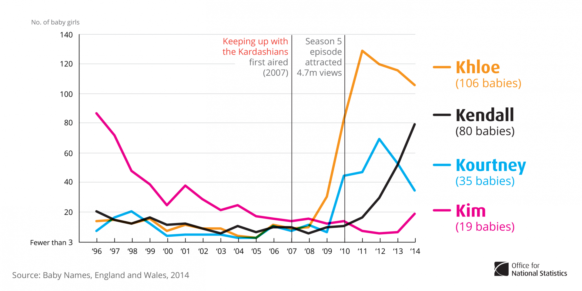 Līnijas attēlo jaundzimušo meiteņu vārdu Hloja (Khloe), Kendala (Kendall), Kortnija (Kourtney) un Kima (Kim) popularitāti. Šie vārdi saistīti ar Kardašjanu šovu, tāpēc diagrammu papildina paskaidrojumi, kad notikusi pirmās sērijas pirmizrāde un populārākās 5. sezonas parādīšanās TV ekrānos gads (2010). Avots: Lielbritānijas valsts statistikas birojs