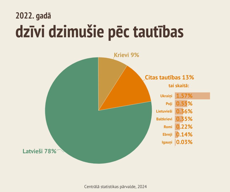 Sektoru diagramma kombinēta ar stabiņu diagrammu, lai parādītu detalizētāku dzimušo sadalījumu pēc tautības un vienlaikus pamatdiagrammā nebūtu pārāk daudz sektoru. Avots: Centrālā statistikas pārvalde