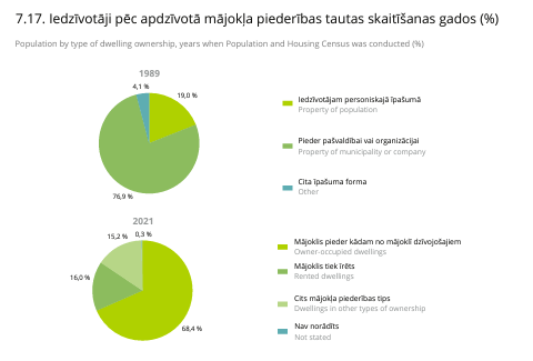 Iedzīvotāji pēc apdzīvotā mājokļa piederības tautas skaitīšanas gados – divās sektoru diagrammās parādītas izmaiņas laikā. Diagrammās redzams, ka 1989. gadā tikai 19 % mājokļu bija iedzīvotāju personiskajā īpašumā, savukārt 2021. gadā 68,4 % mājokļu piederēja kādam no mājoklī dzīvojošajiem. Divas sektoru diagrammas izvēlētas, jo mājokļa piederības veidi šajos gados ir mainījušies, bet ir pietiekami līdzīgi, lai varētu būt aptuveni salīdzināmi.