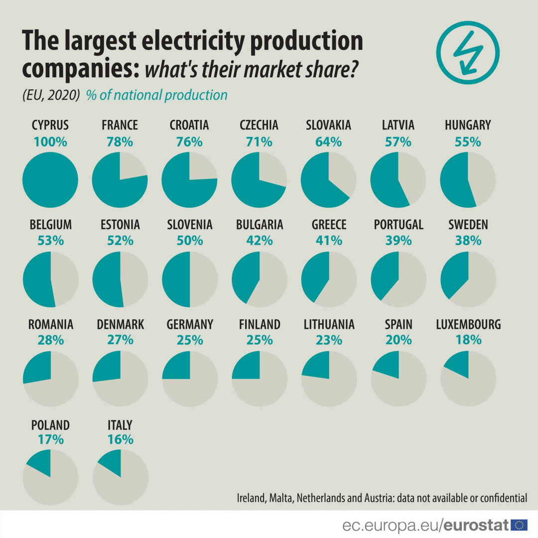 Sektoru diagrammas parāda, cik liela ir lielākā elektroenerģijas ražotāja tirgus daļa ES valstīs. Informāciju palīdz uztvert tas, ka katrā diagrammā ir tikai viens izcelts sektors un diagrammas ir sakārtotas dilstošā secībā, sākot ar maksimālo vērtību Kiprā (100 %) un beidzot ar vismazāko vērtību Itālijā (16 %).