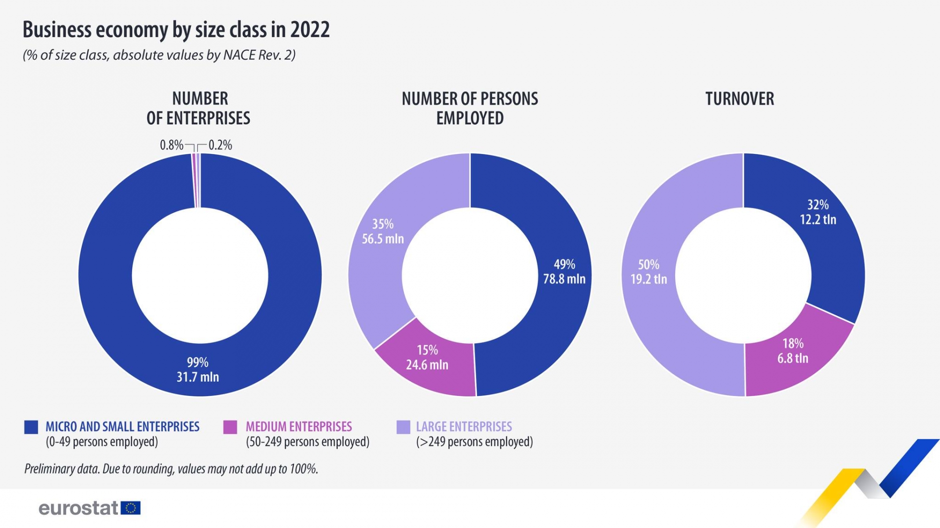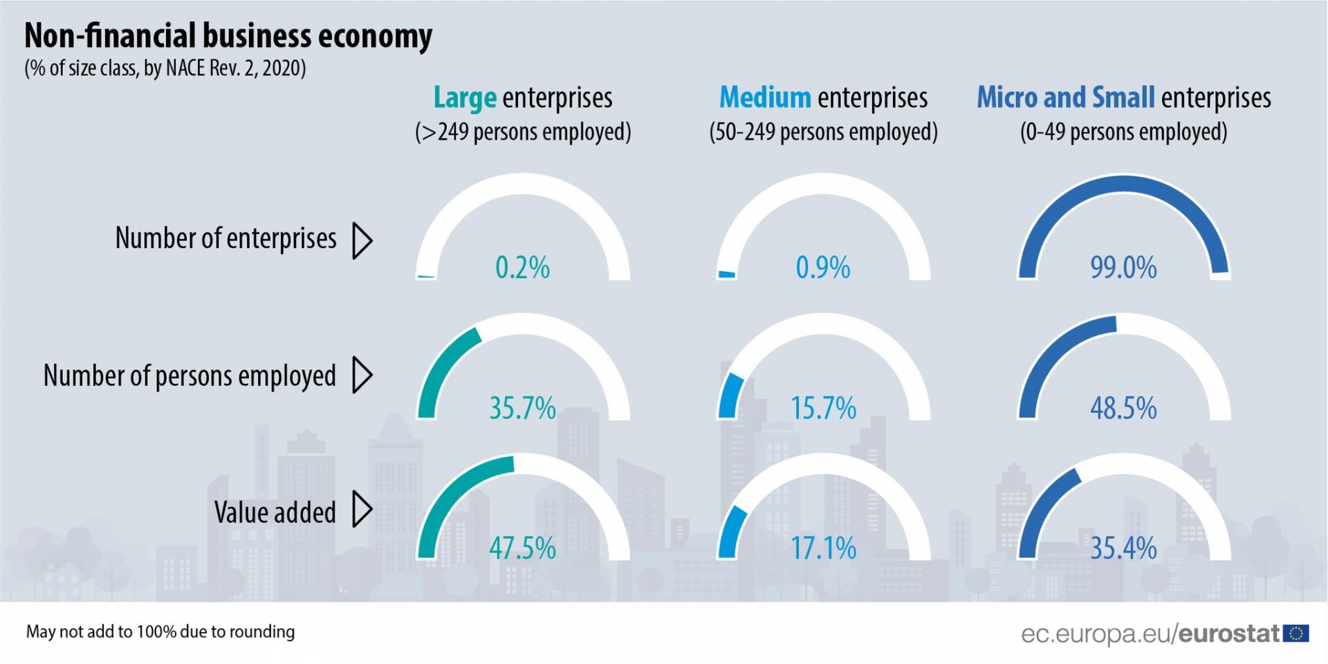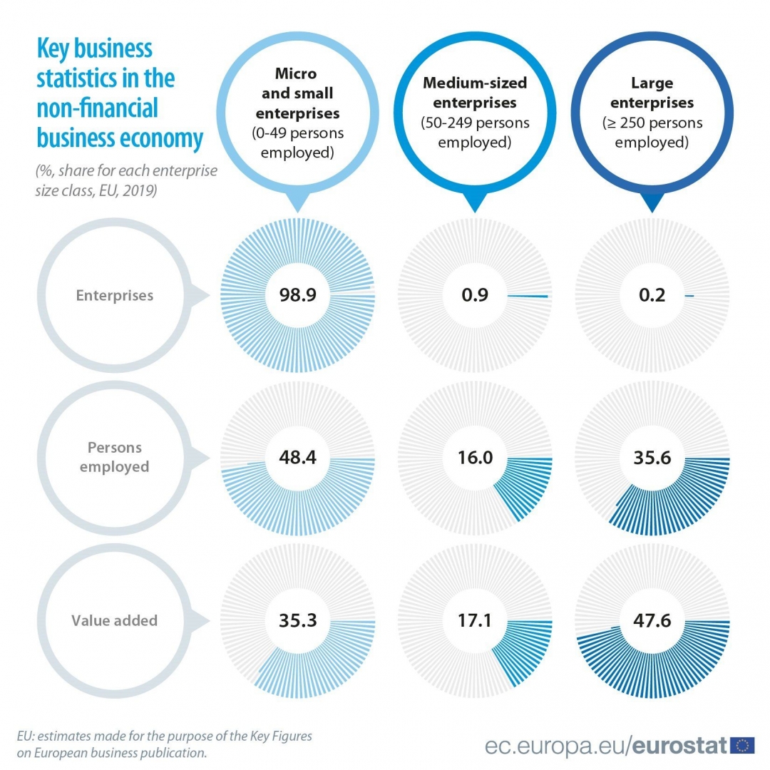 Trīs riņķa diagrammas parāda, ka mazie uzņēmumi veido lielāko daļu no uzņēmumu skaita, aptuveni puse no nodarbinātajiem strādā mazos uzņēmumos, savukārt lielie uzņēmumi veido pusi no pievienotās vērtības.