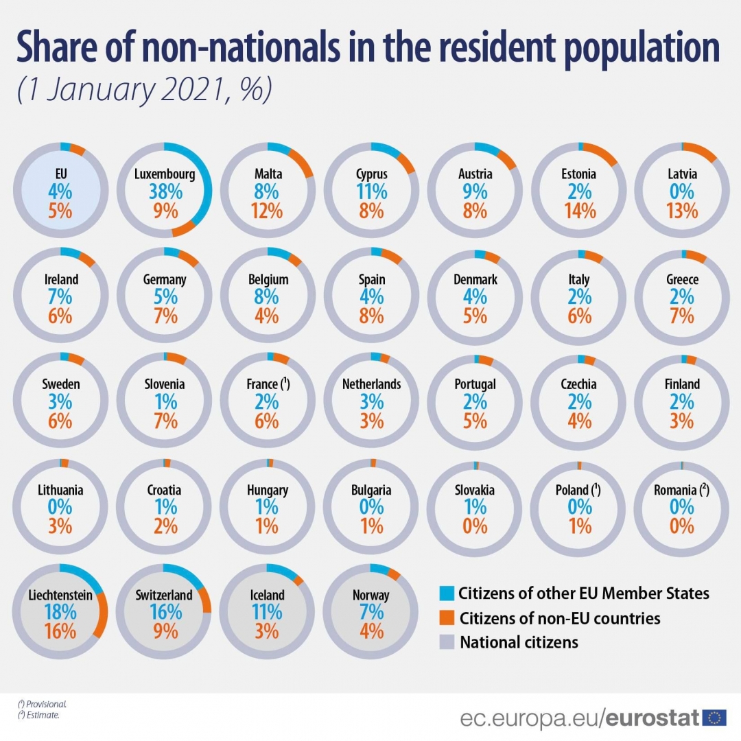 Riņķa diagrammas parāda, cik liels ir iedzīvotāju, kam ir cita valstiskā piederība, īpatsvars pastāvīgo iedzīvotāju kopskaitā ES valstīs. Katrā riņķa diagrammā ir izcelti tikai divi sektori: citu ES valstu pilsoņi un citu (ne ES) valstu pilsoņi. Lai datus varētu vieglāk nolasīt, tie ir sniegti katras riņķa diagrammas centrā.