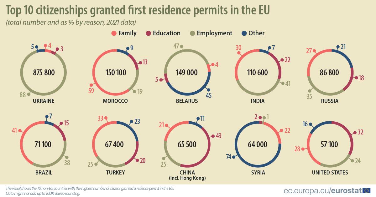 Riņķa diagrammās attēloti uzturēšanās atļauju saņemšanas iemesli (ģimene, izglītība, nodarbinātība, cits). Katra riņķa diagramma attēlo vienu no TOP 10 uzturēšanās atļauju saņēmušo personu valstiskajām piederībām. Diagrammas sakārtotas dilstošā secībā pēc uzturēšanās atļauju saņēmēju skaita – pirmā ir Ukraina. Uzturēšanās atļauju saņēmēju skaits norādīts diagrammas centrā.