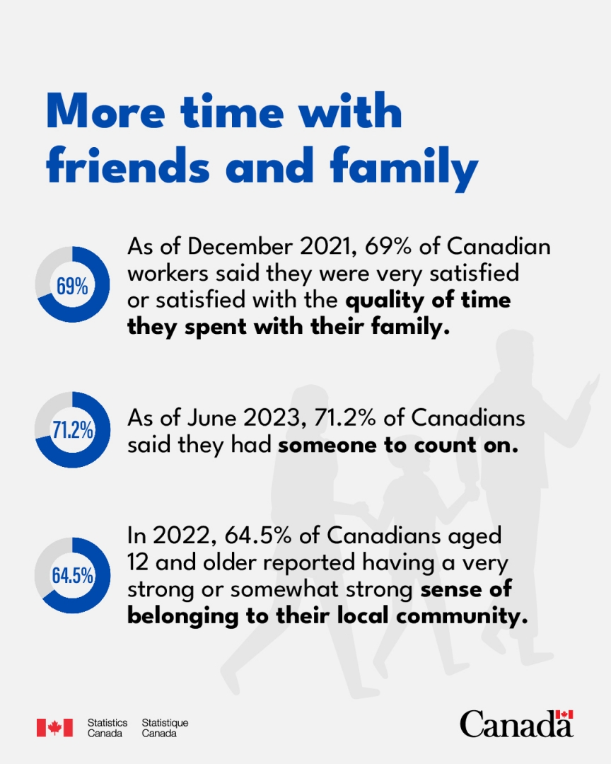 Trīs riņķa diagrammas attēlo Kanādas iedzīvotāju atbildes uz jautājumiem par dzīves kvalitāti. Katrā diagrammā attēlots pozitīvo atbilžu īpatsvars.