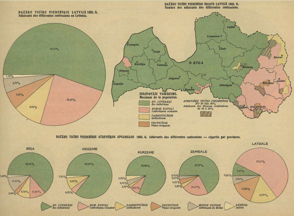 Salīdzināmajās sektoru diagrammās attēlots Latvijas iedzīvotāju sadalījums pēc ticības 1935. gadā. Salīdzinot ar pārējiem reģioniem, Latgalē ir ievērojami vairāk Romas katoļu ticībai piederīgo. Apļu laukumi reprezentē iedzīvotāju skaitu reģionos.