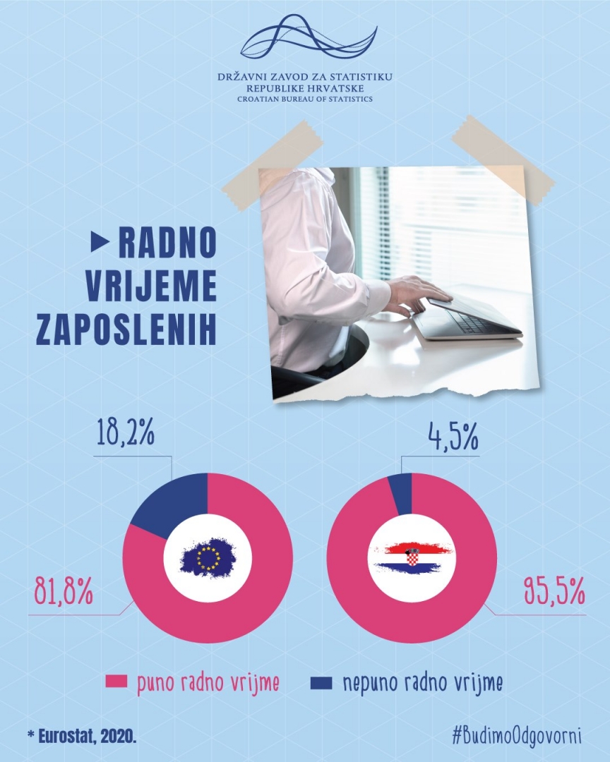 Divās riņķa diagrammās salīdzināti pilna un nepilna laika nodarbinātie ES vidēji un Horvātijā. Redzams, ka Horvātijā daudz mazāks īpatsvars nodarbināto strādā nepilnu slodzi.
