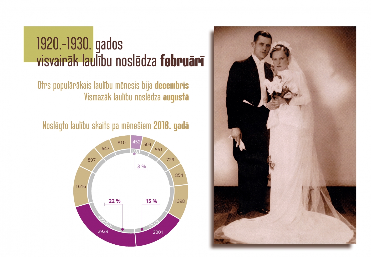 Riņķa diagrammā attēlots noslēgto laulību skaits pa mēnešiem 2018. gadā. Šajā gadījumā viens vesels ir divpadsmit viena gada mēneši. Redzams, ka visvairāk laulību noslēgtas vasaras mēnešos – jūlijā un augustā. Kas ir pretstatā tekstā sniegtajai informācijai, ka 1920.–1930. gados visvairāk laulības tika noslēgtas februārī un decembrī.