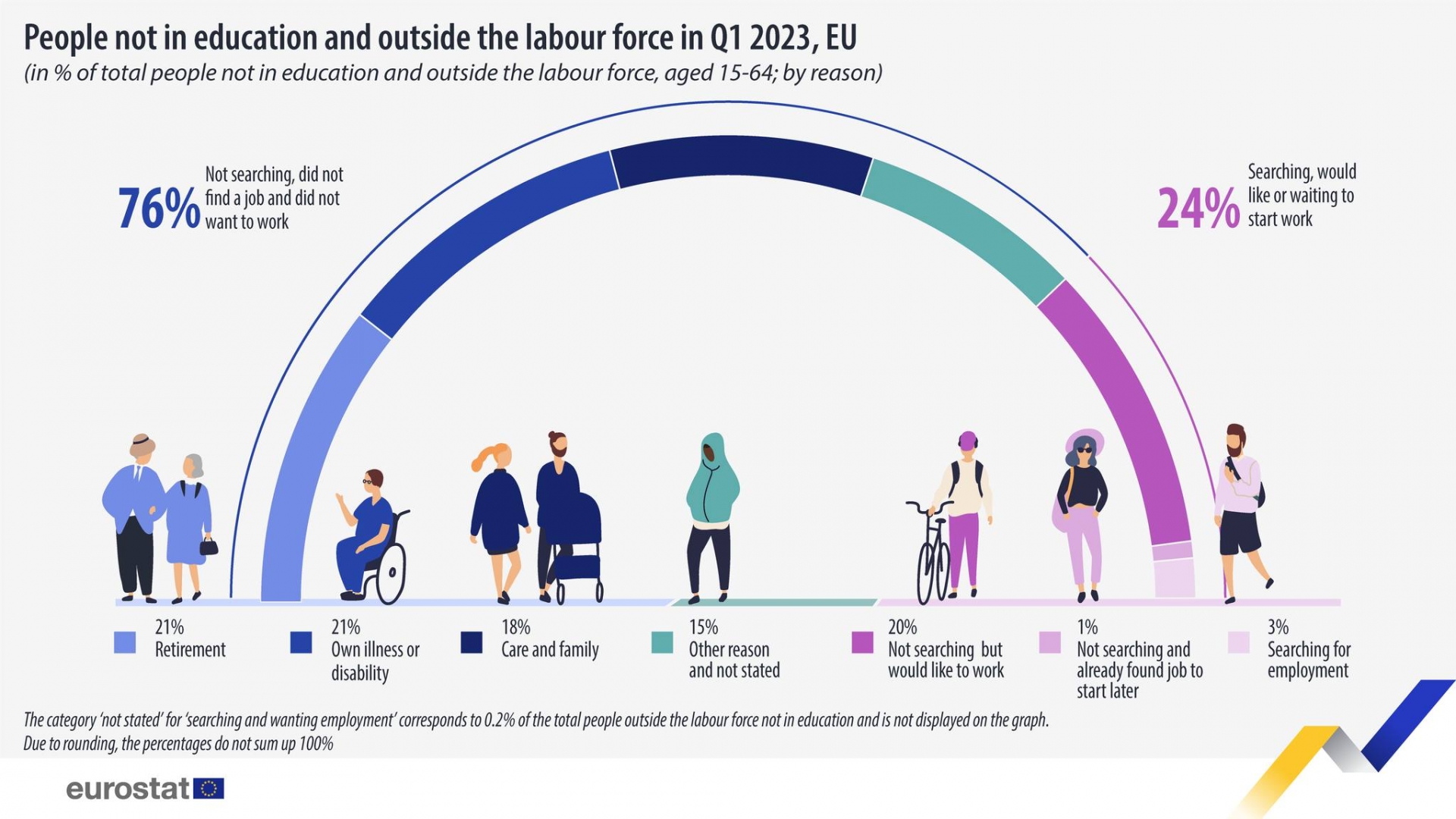 Pusriņķa diagrammā attēloti iedzīvotāji, kas nav iesaistījušies darba tirgū un nemācās Eiropas Savienības valstīs. Ar lielāku loku iezīmēti 76 %, kas nav iesaistīti darba tirgū, un apakšējā lokā var aplūkot šīs sabiedrības daļas detalizētāku sadalījumu (pensijā, nevar strādāt slimības un invaliditātes dēļ, rūpējas par ģimenes locekļiem u.c.). 24 % no visiem iedzīvotājiem ārpus darba tirgus vēlētos atgriezties nodarbinātībā.