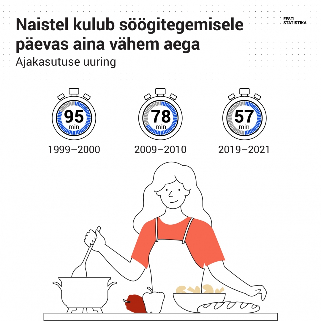 Trīs riņķa diagrammās, kas stilizētas kā hronometrs, attēlots laiks, ko sievietes Igaunijā pavada, gatavojot ēst. Pirmajā riņķī, kas attēlo situāciju 1999./2000. gadā, tās ir 95 minūtes.
