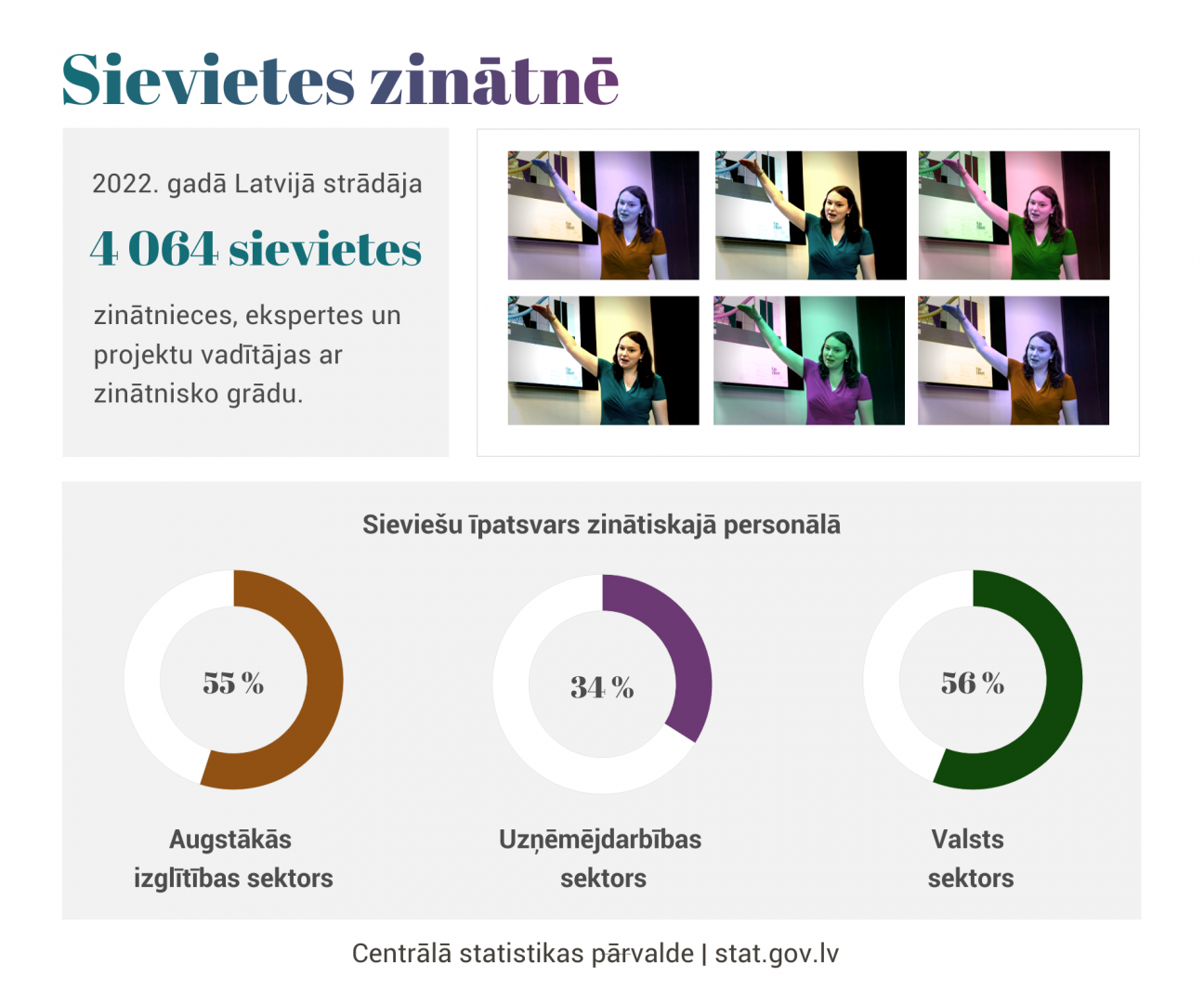 Trīs riņķa diagrammās attēlots sieviešu īpatsvars zinātnieku kopskaistā dažādos sektoros (izglītības, uzņēmējdarbības un valsts sektors).