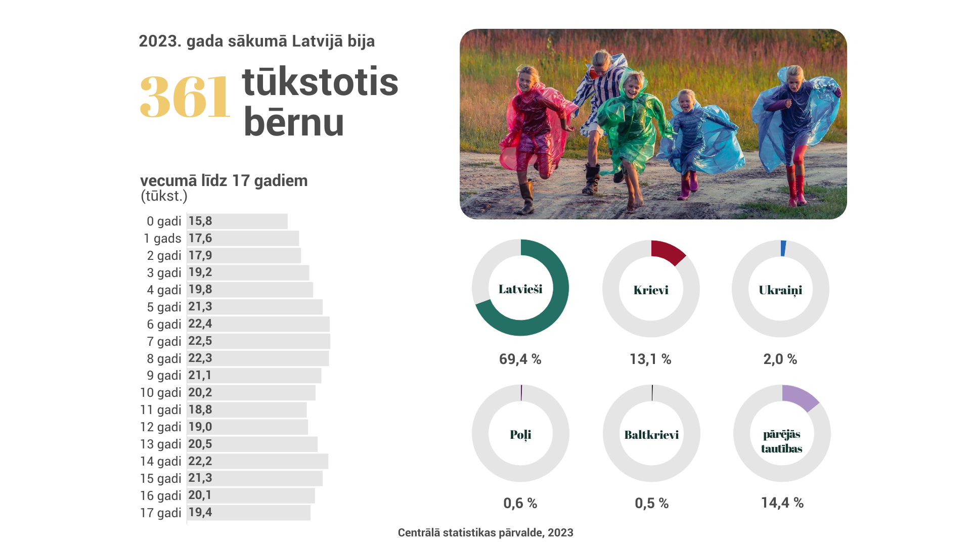 Sešās riņķa diagrammās attēlots Latvijas bērnu sadalījums pēc tautībām. Šo informāciju tikpat labi varētu attēlot arī vienā apļa vai riņķa diagrammā. Izvēlēts šāds risinājums, lai būtu vizuāli interesantāks un pārskatāmāks dizains. Avots: Centrālā statistikas pārvalde.