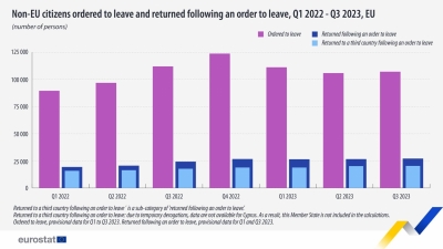 Grupētu stabiņu diagramma attēlo trešo valstu piederīgo personu skaitu, kas izraidīti un atgriezti uz citu valsti no Eiropas Savienības valstīm. Katrā stabiņu grupā ir trīs stabiņi: violets stabiņš attēlo kopējo personu skaitu, kas saņēmuši pavēli atstāt valsti. Tumši zils stabiņš attēlo uz citu valsti atgriezto personu skaitu, un trešais gaiši zilais stabiņš attēlo skaitu, kas atgriezti uz mītnes zemi (ārpus Eiropas Savienības). Gaiši zilais stabiņš pārklājas ar tumši zilo stabiņu, bet ir šaurāks. Avots: Eurostat