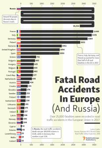 Joslu diagrammā attēlots mirušo skaits ceļu satiksmes negadījumos Eiropas valstīs un Krievijā. Jāņem vērā, ka diagrammā attēlots absolūtais skaits, tāpēc valstis ar mazu iedzīvotāju skaitu var nepatiesi izskatīties kā “drošas” un tādas, kurās notiek maz satiksmes negadījumu. Vispareizāk šādu diagrammu būtu attēlot blakus sniedzot informāciju par relatīviem rādītājiem (mirušo skaits uz 100 000 iedzīvotājiem). Avots: Carlos Coelho