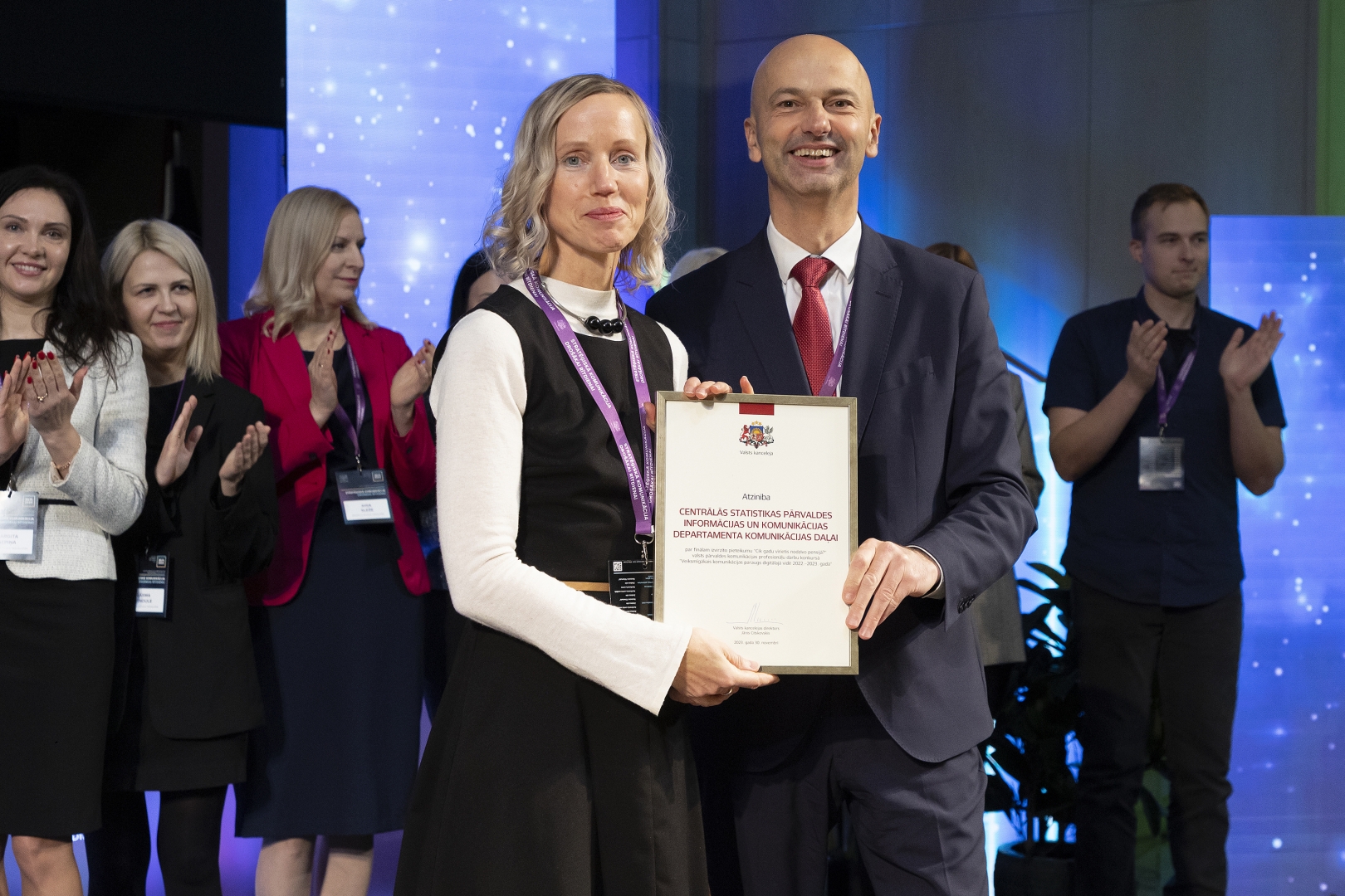 CSP informācijas un komunikācijas departamenta direktora vietniece Gundega Kuzmina saņem atzinību no Valsts kancelejas direktora Jāņa Citskovska par konkursa finālistu “Sveicam dzīvnieku aizsardzības dienā!”